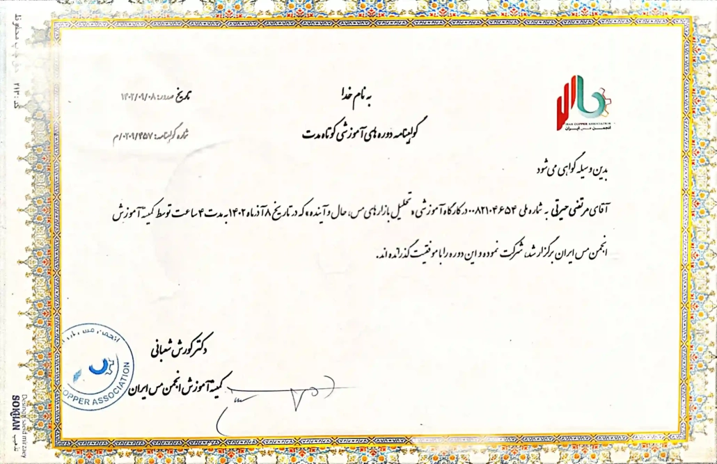 کارشناس خرید و فروش شرکت مس حیرتی مسئولیت تأمین کاتد پالایشی و لیچینگی و مدیریت فرآیند فروش مفتول مسی سایز ۸ میلیمتر را بر عهده دارد. تمرکز اصلی این بخش بر ایجاد همکاریهای پایدار و حرفهای با تأمینکنندگان و مشتریان و همچنین تضمین کیفیت، دقت و سرعت در چرخه تأمین و عرضه محصولات مسی است.